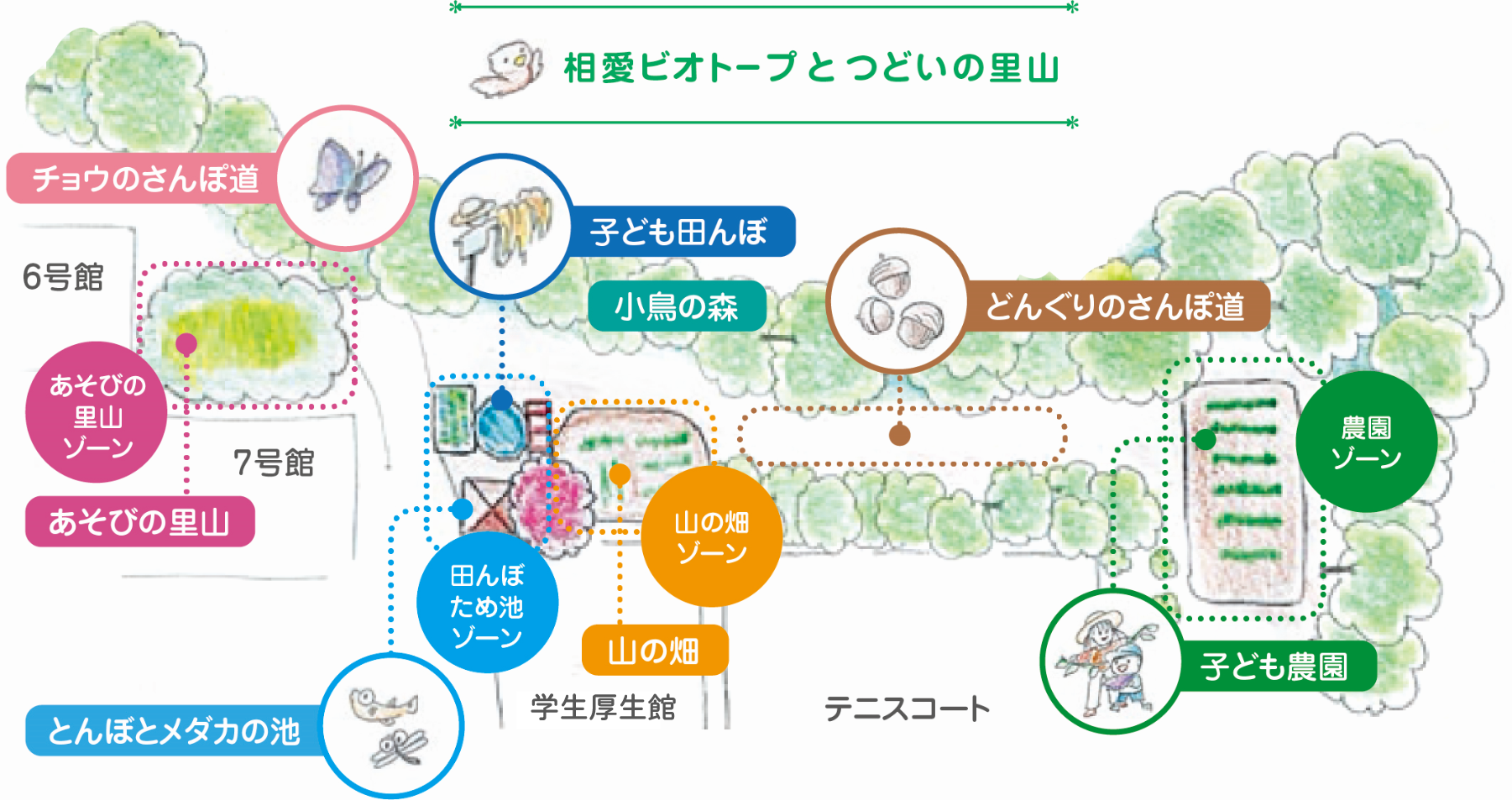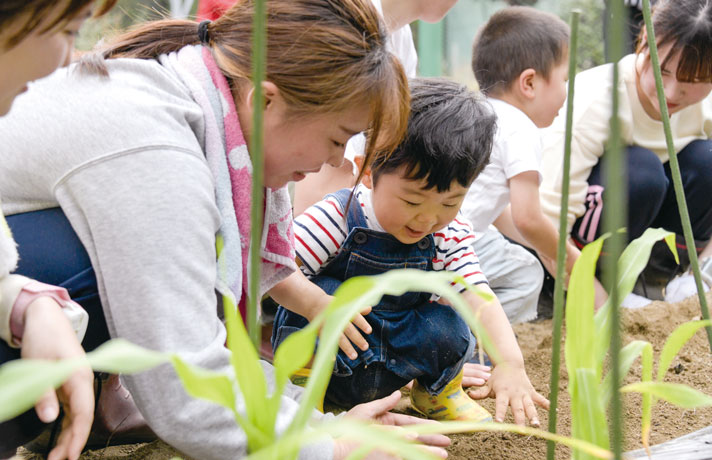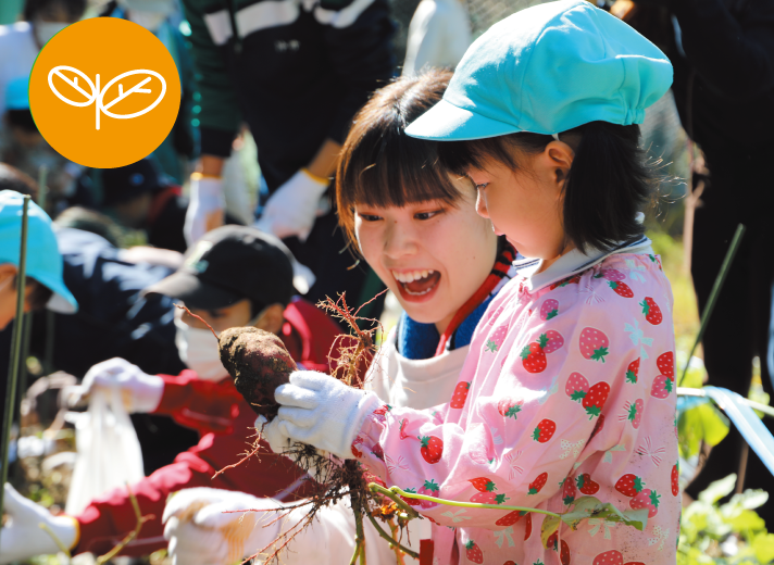 キャンパス内に四季を感じる里山環境を再現しています。様々な生き物たちとふれ合える「田んぼ・ため池」に「あそびの里山」、野菜を栽培する「農園」に「山の畑」。豊かな自然学習環境での様々な実践経験を通して、豊かな感性を育みます。