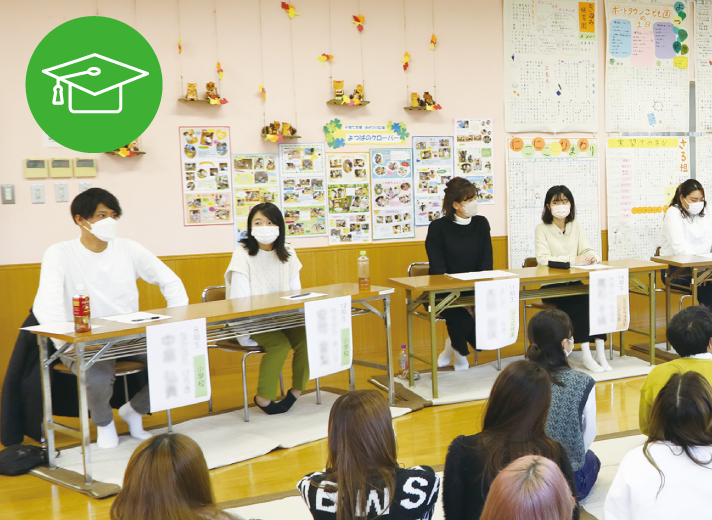 保育士、保育教諭、幼稚園教諭、小学校教諭をめざして、子ども理解や保育内容の理解、科目理解について、体験的にしっかりと身につけていきます。